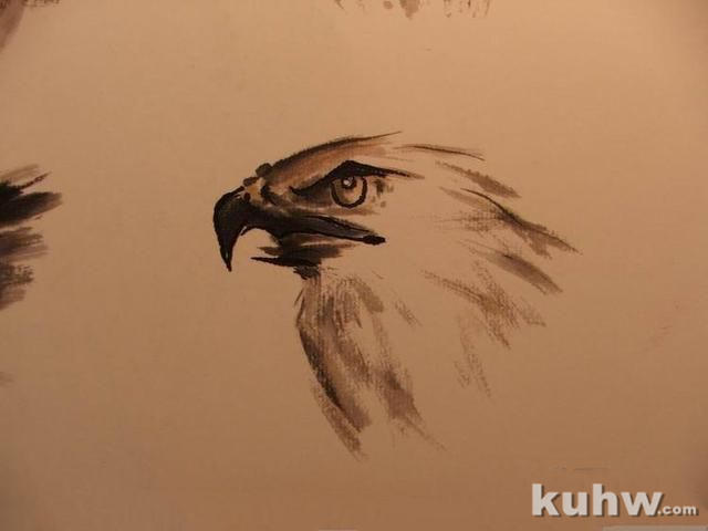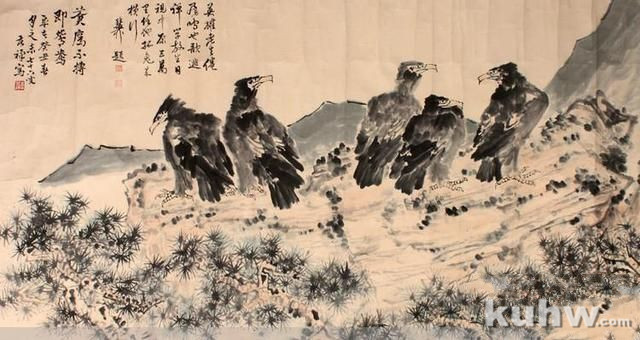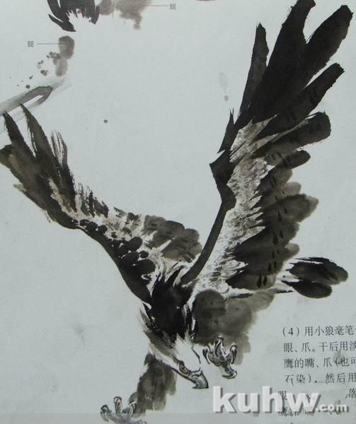 4、画飞羽多用狼提、大石獾或大山马笔。运笔时略带侧锋,力要均匀。尾羽墨色较飞羽淡适当留有空白可以增强层次的空间感。