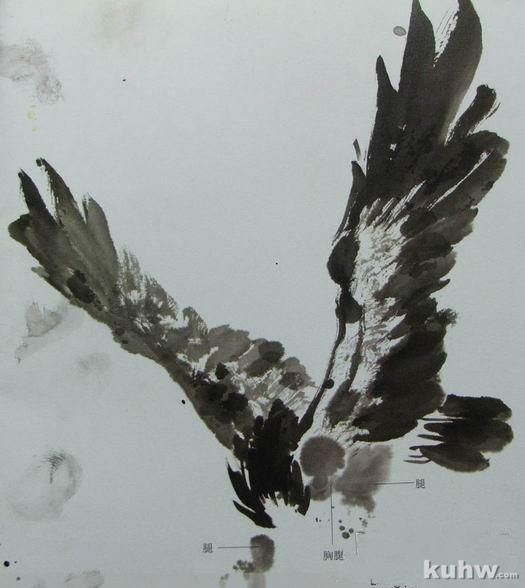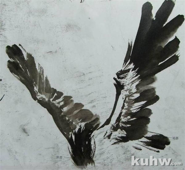 1、开笔取势一般先从背部。取较大号狼毫或獾毫笔饱蘸清水,去多余水后蘸适量浓墨稍调,然后依其长势画前背羽片。行笔要自然,内点外推要随意。