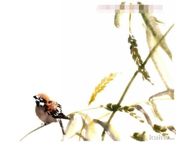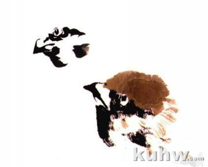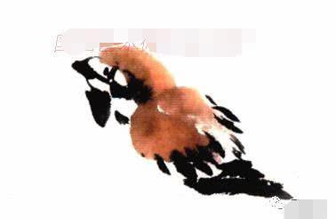 背部画法:先用赭墨直接点写麻雀背部,用笔要虚实相生,将干未干时,用马蹄点重墨点出背部的斑纹。