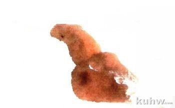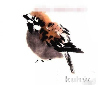 二、麻雀分步示范先用赭墨画出麻雀的头与背部,再用重墨画出喙、眼,随后以重墨画出麻雀的翅膀及尾羽,注意尾羽的朝向,要生动有致。再用淡墨点出麻雀的胸腹部,用重墨画出爪子,最后在半干之际用重墨点出背部斑纹即可。