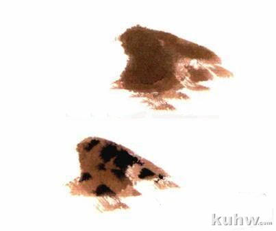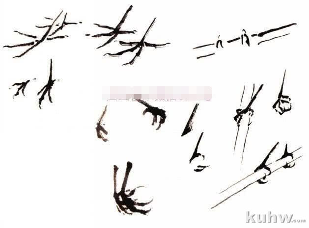 爪的画法:用重墨直接点写爪子,注意站立、飞翔与抓枝等不同动态的表现。鸟爪有节,好似人之手指,可以节处转弯,不可任意画弧线。