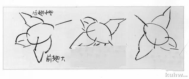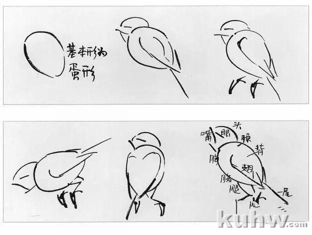 部名称:头、眼、嘴、颈、背、翅、尾、胸、腹、腿、爪,作画时按此顺序点写,注意前后翅的大小关系。