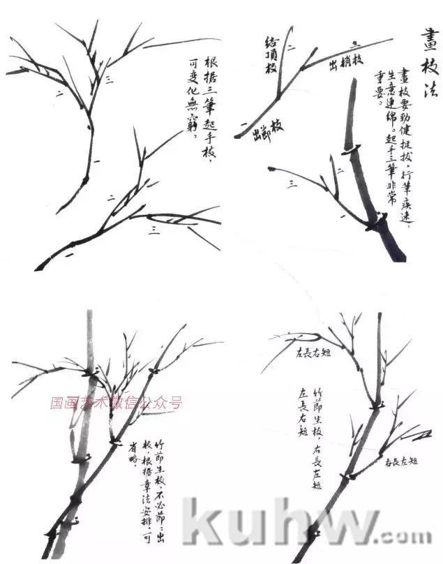 写枝要遒健圆劲,生意连绵,行笔疾速,不可迟缓。老枝要挺上而起,嫩枝则各柔而婉顺。叶多而枝覆,叶少而枝昂。风枝、雨枝触类而长,亦在临时变化,不可拘于一律。↓↓↓