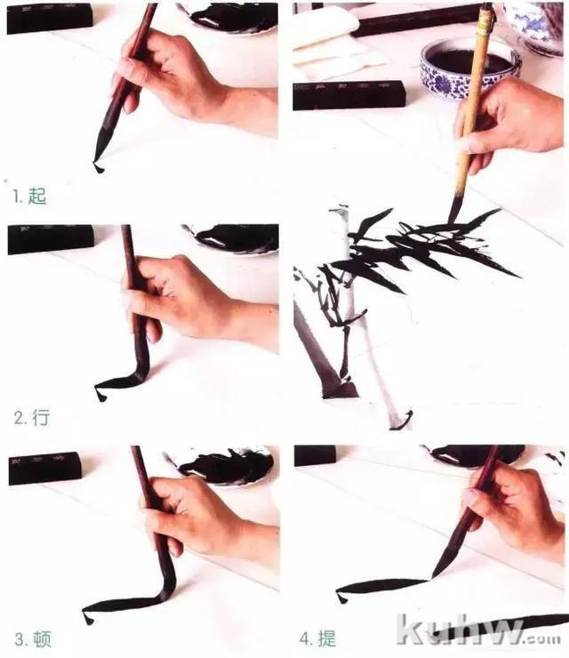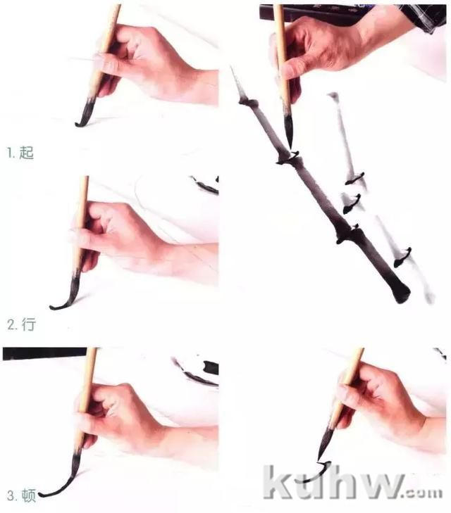 用笔:起、行、顿、提,行笔要有弧形,要苍劲沉厚,写节不宜过大,也不宜太小,要以竿的粗细为准。