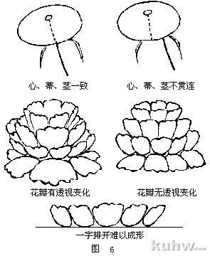 3.点簇第一组(或第一层)花瓣时,要紧凑些,且成弧形排列。切忌一字排开,松散而难以成形(图6)。
