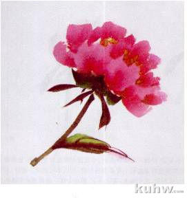 牡丹花头的点簇练习,可分别用墨或色彩。画粉红色牡丹,用较大羊毫笔,先在白粉中调入少量曙红(牡丹红)或胭脂,用笔蘸饱后,再在笔尖上蘸适量曙红或胭脂,笔尖向内,先画里层淡瓣,再画中心深处,依次层层画出,浓淡相间方见精神。但要注意块面的统一集中,不要红一块、白一块,使画面过分散乱。花头点好后画花萼,待稍干再用藤黄点花蕊(图7)。