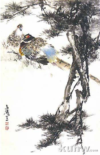 虽然花鸟画不像山水画常有移动视点的表现法,通常视 角比较稳定,但我们观察时可运用移动视点的方法,选取最美 角度写生,并注意花、枝、叶的大小比例。画花朵可从花蕊花 瓣入手,通常先画最完整、最前面的一瓣,再四外扩展,花瓣 太复杂的可进行概括,要注意其造型美。画叶也是如此,除了 注意叶序、结构之外,也要注意仰、垂、向背与疏密、前後叶 的变化,最後画枝干,大干还要画出皮纹,如梅花的大干要苍 老、皮纹要斜皴,小干要挺拔有力,桃干皮要横皴,松干皮要 鳞皴,紫薇花干皮较光滑等不同种类的枝干特点。