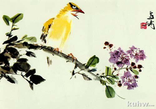 於禽鸟的赋采法略有不同,下图为吴学让教授的示范,首 先白描後以淡墨分染,然後以颜色第二次分染,乾後第三次铺 色,接著第四次梳毛,第五次铺色 梳毛(丝毛)是化翎毛( 或畜牲)所常用,为了强调羽毛松软而细密的感觉,梳羽毛法 的原则是淡色羽毛用深色梳,深色羽毛用淡色梳。