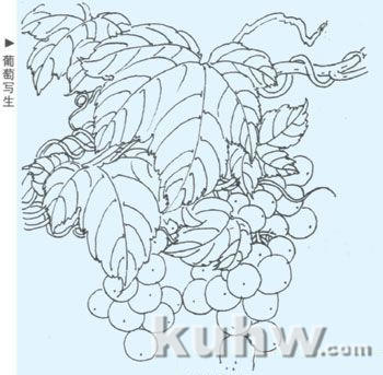 1.果实:画果实要画得累累压枝、水分充足(有沉重的感觉)比市面上出售的葡萄更鲜美,使人看后能引起食欲。买来的葡萄放在篮子里或瓷盘中可以用来写生,吃完葡萄后的小枝也要注意观察,了解它的生长结构。