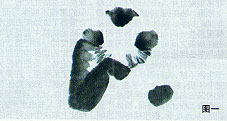 ①先以大笔触点写猴的顶部和颊部,再扫出颌下浮毛。后以侧锋写出上臂,而后写出小臂与手臂(见图一)。