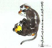 理解了猴子的结构之后,就可以把它各主要部位的基本形态表现于画面。在表现方法――技巧方面,用的是“写”的技巧,即如书法的用笔,用的是“写”的技巧,即如书法的用笔,笔笔写出形态来。例如猴头,以大笔触浓淡墨写出顶部和颊部,以小笔触淡墨写出耳边与凳下的浮毛,再用浓墨线写出眉弓、眼、鼻、嘴、耳与面部表情纹。常用猴头形态有正脸、侧脸、侧背脸、“四分之三”脸以及俯、仰、回等等。还宜留意猴的雌、雄、长、幼特征。雌猴头略小而圆,比较秀气。雄猴方略大而方,两颊与下凳的毛丰满,显得很雄壮。另外,雄猴的脸比雌猴要长,尤其老雄猴,鼻与“人中”更长。幼小的猴,头圆耳大,眼鼻口的“脸三角区”面积在整头面积中所占比率小于大猴,但眼睛并不小。再有,猴子的臂、手和似臂似手的下肢和与脚,非常灵活多变,特别能表现猴子的神态。在这方面,尤要注意:“写”务必要依据各关节部位在不同方向下的透视与结构的变化而掌握行笔的顿挫。猴手的掌比人的长,拇指比人的短,中指最长而粗,食指最灵动。先用大笔触浓淡墨写出臂、腕,再以中锋用笔写出五指,画下肢方法程序也如此。还有,猴子尾巴也是猴子机灵表现的重要“形体道具”,宜以浓淡墨中锋粗笔触写出S形的动态和“短毛肉棍棍”的质感。这里应注意,尾骨是脊椎骨的一部分,所以画尾巴一定要与腰、骶部形成过渡关系,否则就“折了”。(附图为李燕所作,图一为猴主要结构部位示意图,图二为《侧面猴》)(8)