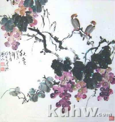 一串葡萄中的一组有两三枚浅的,画时笔中水分要多些,各枚葡萄之间的位置要有错落,避免形成直线。可在浅葡萄的一侧,画中间色和深颜色。虽深色葡萄的用色量大,但笔中仍然需要含有一定的水分。每枚葡萄之间的空隙要用比葡萄稍重的颜色充填。葡萄珠相临或空隙间要填上色,颜色相接而渗化是正常的,要有浑然一体的感觉。如此完成一串葡萄中的一组,这样的三、五组合在一起便组成一串。在一幅画中要注意葡萄的虚实,要近实远虚。虚的葡萄颜色浅淡而且不需要有很强的立体感。葡萄小枝、果脐不可画得太清楚。有时在半干时罩染一遍淡石青(石绿)水,既可画虚推远又可将颜色统一。