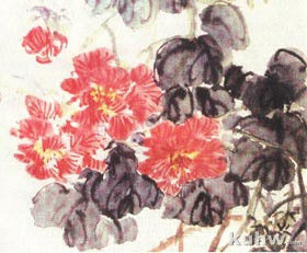 一幅好的写意花卉,无论运用哪种表现方法都应注重墨骨,正如工笔花卉那样,洗去铅华,依然是一幅劲整有力的白描勾勒。虽属点彩方法,亦应加意用墨,用笔用墨到家,然后赋彩。墨借色彩,就愈显光华璀璨,色依墨光,就更能表现出花卉的质感。若纯以色彩为重,一味写其娇艳,便容易画俗,更难以表现其骨气。所谓以笔墨为筋骨,以彩粉为肌肤,是写意花鸟画技法的关键。
