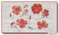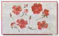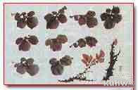 月季花叶多为五出叶。由于叶子的方向不同和秀视遮挡就有了或三片或四片或五片不同方向的变化。叶子用墨或颜色画均可。调叶子的绿色时,藤黄要少,花青多些,调成绿色。也可略调些墨,使颜色沉稳。枯叶用草绿,调些赭墨。嫩叶以草绿色调些胭脂。叶脉的勾法可简可繁,视点叶后的效果而定。如点叶的笔墨均较理想,则可在每片叶脉的基部提一笔,不破坏原来效果。如点的叶子不甚理想,就勾主脉及支脉。有些花叶还可在叶子周边点些小点,因为叶子边缘是锯齿状。