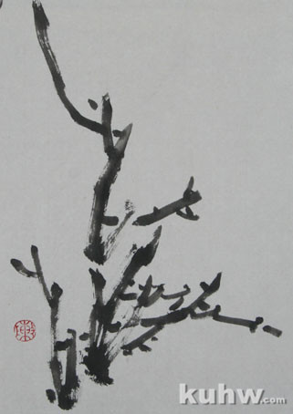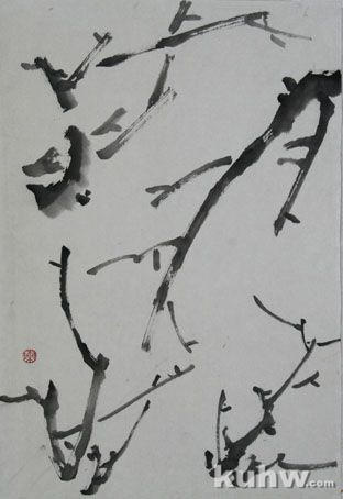 勾皴法 用硬毫笔,在笔锋上蘸少许墨,略干为宜,中侧锋行笔,抑扬顿挫画出老干的双侧,线条要顿挫得当,起伏、断续要和谐统一。然后侧锋、干笔皴擦干体,注意肌理效果,用笔过程要体现出老干的特点。用浓墨在梅干上点苔,苔点要有大小疏密变化,尽显自然之气。干后可以着淡赭色。