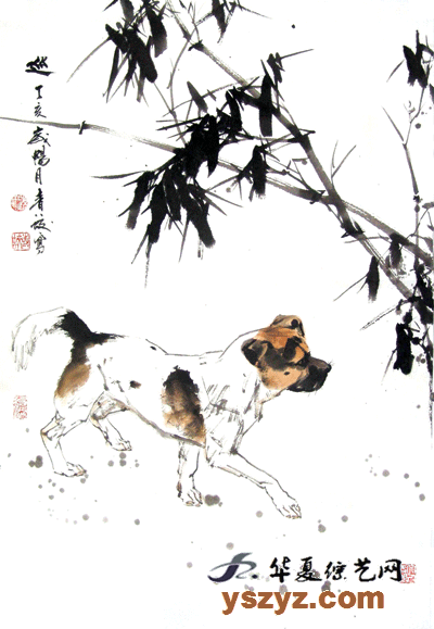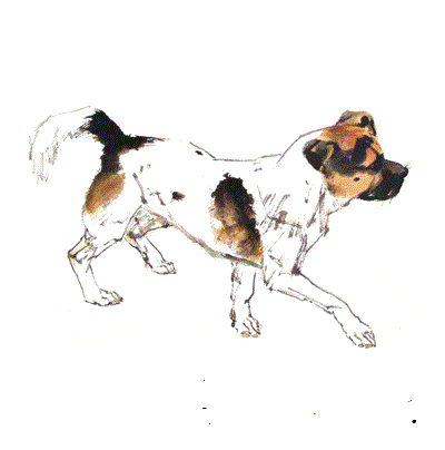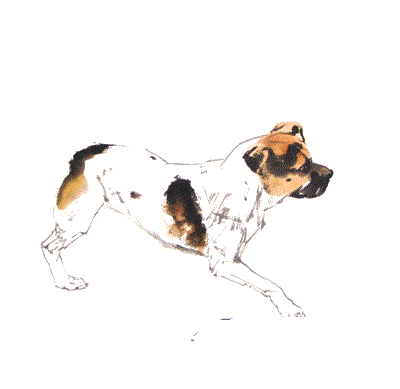 步骤4:最后勾画狗尾,赭石色敷眼,画出另外两肢,淡赭青色敷画趾及略敷狗体局部,勾画短须。狗的造型要硬朗,形象要精干。(见图四)
