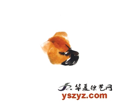 步骤1:兼毫笔蘸藤黄含少许花青调赭石色 出狗的头部,按头部结构从额、眼眶、腮、耳依次画出,用余色笔蘸次深墨 画出鼻梁,蘸深墨勾画眼周墨块,撇出上颌墨块,勾画鼻镜和口部。(见图一)