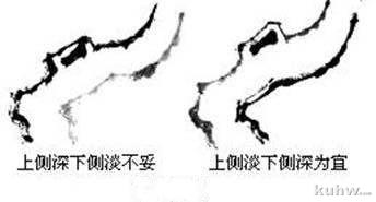 1、用较大的笔,先用清水调墨,使笔尖、笔腹、笔根都含淡墨(宜稍干),再以笔尖蘸浓墨,然后在盘子里稍加调整,使浓淡墨浑然结合。落笔时以侧锋为主,要胸有成竹,大胆沉着,运笔要稳健,有快慢、顿挫、转折。干湿浓淡依结构随之变化,一笔“写出”老干的雄健之气。在主干和梗枝结合部,用笔要由侧锋渐转中锋。反之,则由中锋渐转侧锋。交替转换笔锋,方能自然生动。