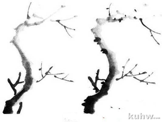 2、主干画出后,要在未干时点苔,同时作适当的线面调整,某些部分过于流滑,可在将干未干时稍加皴擦,以增加质感和层次。 调墨,是画好没骨画的基础。梅花主干浓淡干湿的变化,全凭笔头蘸墨时浓度变化和含水量的多少来决定。整个笔头只蘸淡墨画出来自然是平淡无奇。笔尖、笔腹、笔根蘸墨浓度有别,含水量不同,才能画出生动多变的效果。所以,在以没骨法画主干前,必须懂得合理调墨,也要学会水份的掌握。