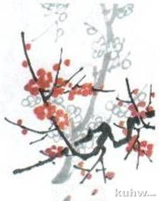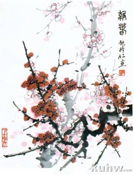 第五步,勾点花心、花须、蕊、蒂等。红梅用浓墨,圈梅可用胭脂勾点花心。然后在圈花轮廓线周围或下侧,用曙红或牡丹红加水调和成浅红圈染或点染。再以更淡的水红色在花与背景空白处洒布一些色点,使画面花丛与花丛浑为一体,增加层次和气氛。但不宜平均洒布仍须注意整个画面的疏密和虚实关系。至此,已基本完成,可将画面悬挂起来审视一下,不足之处再以点垛调整弥补。最后在适当位置落款盖章,画就完成了。