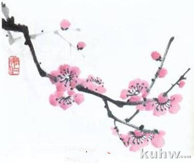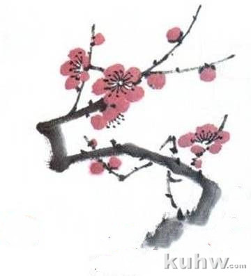 画红梅,花心部分可用黄粉勾点,但效果不及浓墨勾点理想。 点粉红梅花,秃笔先蘸白粉和曙红或牡丹红,加适量清水调成浅红,然后笔尖蘸较深的曙红或牡丹红,逐瓣点即成。最后以浓墨勾点花心、加苔点,即成色调鲜艳明快,赏心悦目的画面。