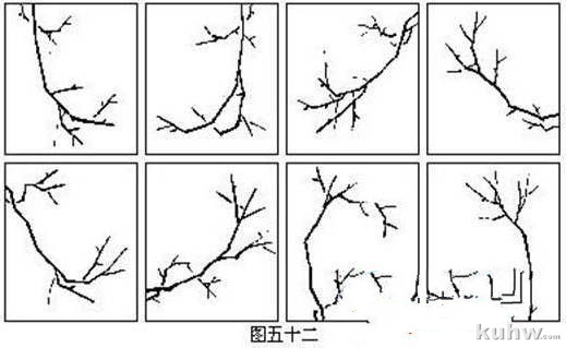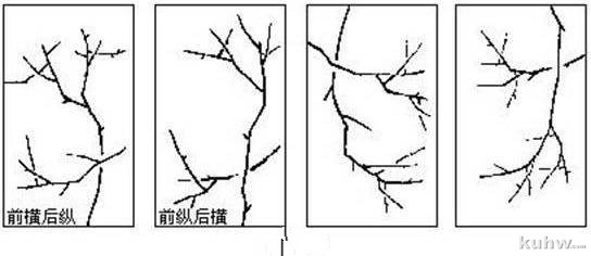 纵横交错法:梅花纷繁多姿,有上发、下垂、横倚和回折等,在构图时可将两种发枝式组合到一个画面上,形成纵横交错。其变化很多,可以前横后纵,也可前纵后横。可以用左横枝交错,也可用右横枝交错。至于“S”、“之”等形式的梅图,实质上都属纵横交错式范围之内,只是交叉时角度有大小运用不同而已。