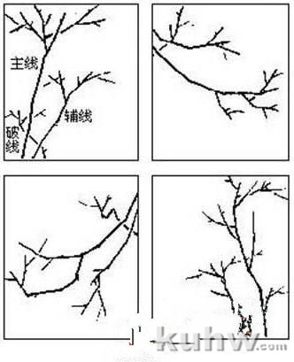 三线组合法:一幅画,梅花枝干态势,可以用几条线作为基本单位来概括成构图骨架。构图时一条线太孤立,两条线仍然单调,三条线四条线足可以了。这三条线中有一条是主线,在全画中起主导作用,在画面中占的份量较重,位置比较明显,势也比较清楚。第二条是辅线,辅线和主线的走势基本一致,略有角度,以辅助主线的势,但比主线要弱(或短、或细、或淡)。第三条是破线,用它把主线和辅线穿插交织起来。三条线交叉的方法很多,可以自下而上。或自上而下,可以从左到右,也可以从右到左,千变万化,全在于灵活运用。