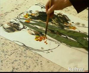 先用墨或者墨绿画叶子,注意画叶子要概括,不要画的太像,把笔墨效果表现出来。
