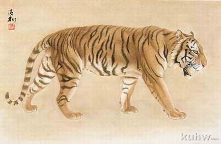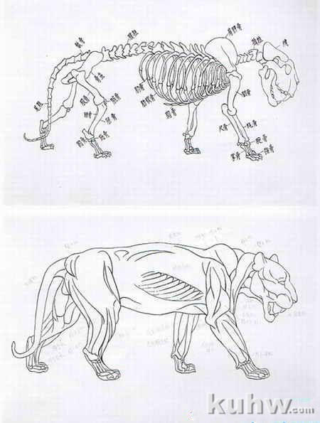 我们画画儿,不像生物学家那样去解剖老虎,我们要了解的是:动物结构、形象知识,了解老虎的整体和每一部分骨骼、肌肉及其所呈现出来的外形,尤其是在运动时各种动势的外形。 比如虎的前肢,看外表是高低无序,但若从内部来了解,它主要由几个骨骼的交接处,加上外面的肌腱组合而成。 虎的体形看起来似乎很复杂,但是如果我们从大的块面基本形去了解、研究它,就会知道它并不怎么难掌握。我们应该把它分为几个大的部分:头、四肢、躯干的结构特点,然后再抓住局部的特点,同时借助解剖的基本知识和通过观察也就能逐步掌握虎的结构了。描绘老虎的皮毛时,要时刻关注虎的骨骼和肌肉结构。俗话说:“画虎难画骨”。这里“骨”指的是:老虎皮毛下肌骨结构的外在张力。请认真观察下图虎的骨骼、肌肉、外形的内在关系。画工笔虎最忌“谨毛而失貌”,切勿特意追求表面的皮毛效果,只求甜俗、乖巧,不注意虎的内在结构,充其量只能算是一张无生命力的华丽虎皮而已。