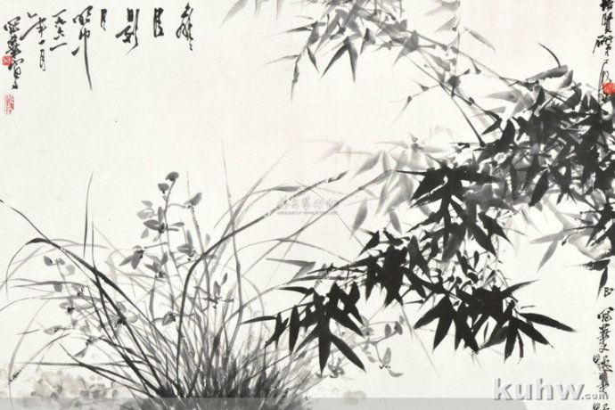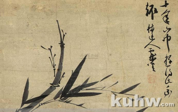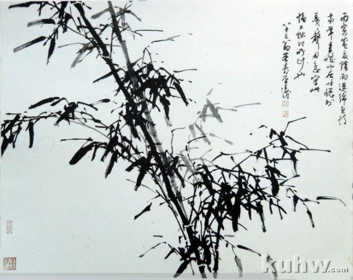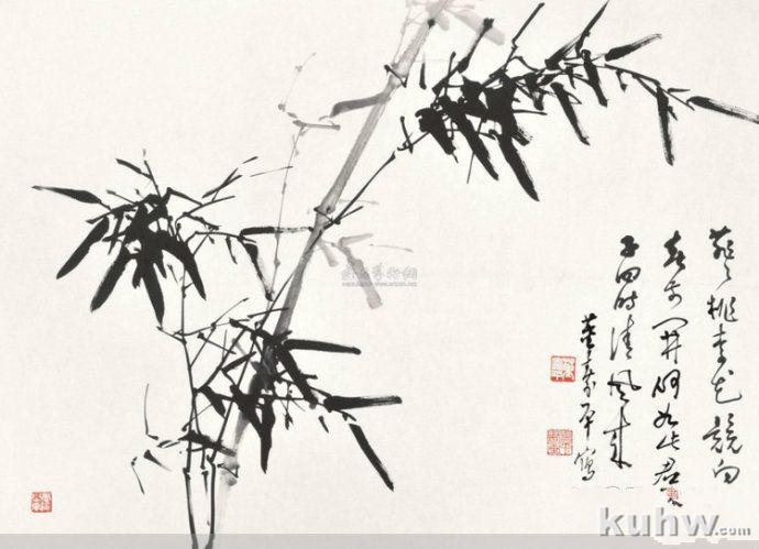 竹---不是木本、草本,藤本;画大竿要求笔力刚健,正气磅礴。直线微带弧线,表达竿的弹性。画枝形态要求与竿成三角 形。表达瘦挺。大叶小叶,长枝短枝,枝枝叶叶均以三角形丛丛配合。画面空处,皆以三角形组成。叶的传统名称很多---有横舟、偃月、片羽;两叶的叫法有; 人字、娥眉,鱼尾,三叶的有;金鱼尾、燕尾、飞雁,四叶的有;落雁、惊鸦。