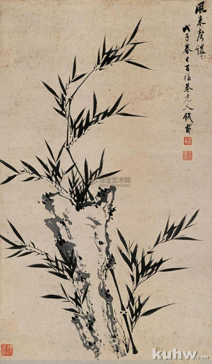 中国画画竹一科,源远流长。早在唐代,唐明皇、王维、吴道子就开始画竹。此 后,五代南唐李煜、李颇、徐熙、西蜀黄筌 父子, 北宋的崔白、 赵昌等, 均善画竹。然而, 真正有写意墨竹流传于世且影响较大的,是 始自北宋后期的文同、苏轼。文同之竹,深 墨为叶面,淡墨为叶背,笔法谨严。苏轼之 竹,严谨中有潇洒之致。金代代表性的画家, 有王庭筠、蔡琏、赵秉文等人。在元代画家中, 画竹成就比较突出的为赵孟 、 管道升、 高克恭、李衔、顾安、柯九思、倪瓒、吴镇、 王冕等。赵孟 根据自己的体会,提出“石 如飞白木如指,写竹还应八法通;若也有人 能会此,须知书画本来同” 。高克恭之竹笔 墨厚重,浓淡分明,自成风格。李墨竹,双勾着色兼擅。顾安之竹叶密,章法布局得 有疏密自然之趣。柯九思之竹风格疏简,以 书入画,提出“写竿用篆法,枝用草书法; 写叶用八分,或用鲁公撇笔法;木石用金钗 股、屋漏痕之意” 。倪瓒画竹,竹竿细,叶亦长而密,似麻似芦,一反常态。大家吴镇 所画之竹,书法用笔,挺劲朴拙,自有意趣, 并有墨竹谱传世。