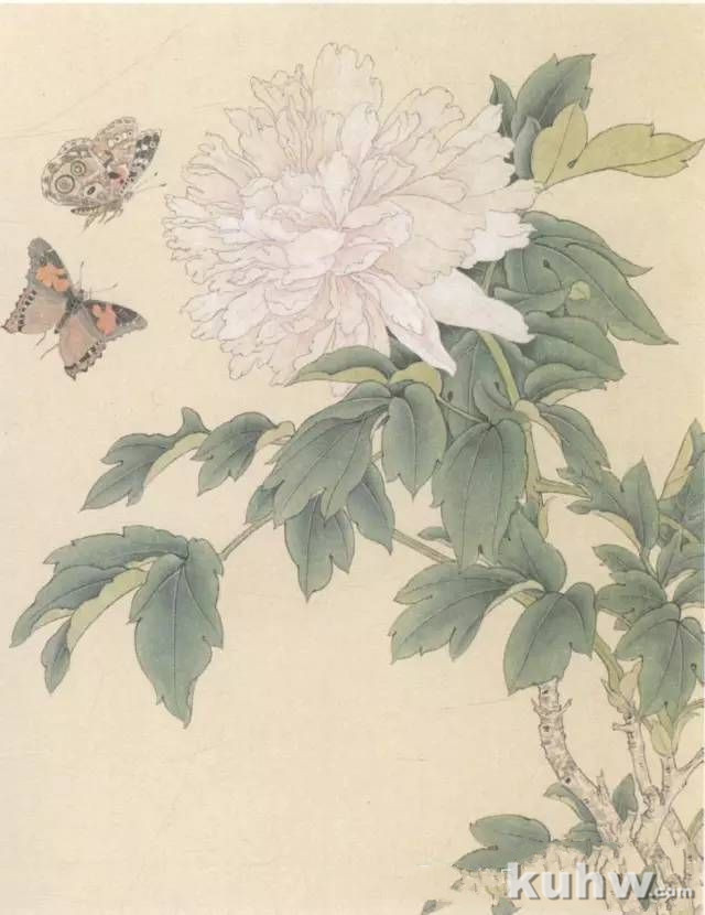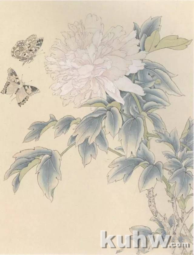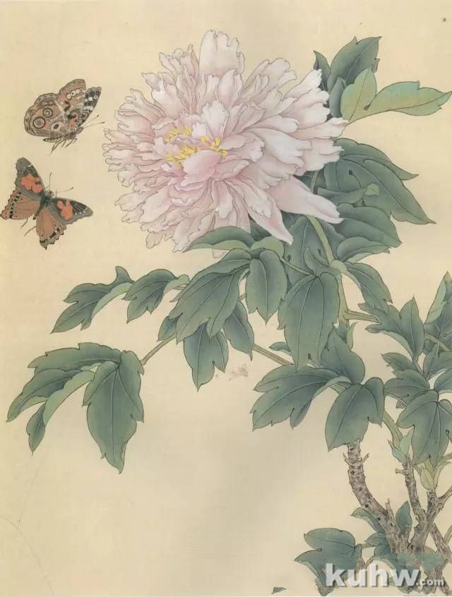 步骤五:朱 加胭脂点蝶眼,花头提白粉,藤黄加白粉点蕊,反叶分染石绿,调整画面,整理完成。↓↓↓