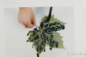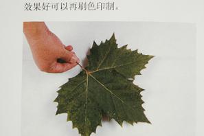 用树叶或花叶直接印在画面上。树叶要有选择,大小适宜,稍硬一点的好用。干叶鲜叶都能用,将墨刷在叶子背面,印到宣纸画面上,用塑料布包一本书平压 上去,便会印出清晰均匀的叶脉纹理来。印时不要用大力,轻重根据需要,掌握一定湿度为宜,其浓淡虚实,疏密大小和方向变化完全依靠作者的绘画修养和经验。 此法要巧用,用好了起画龙点睛的作用。