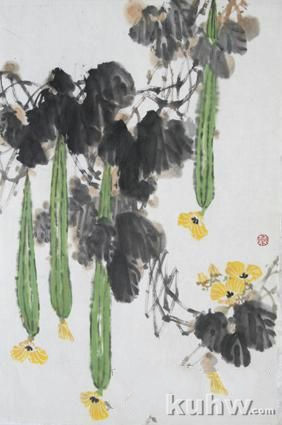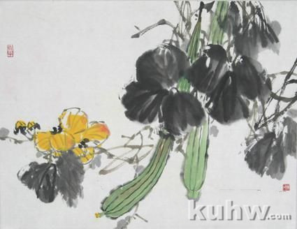 丝瓜花,用白云笔蘸藤黄,笔锋上略蘸赭色,五笔画出,注意花形的正侧俯仰,然后用白粉或赭色勾上花筋,用重墨点上花蕊,再点上花蒂、花苞,几朵花组合而成。