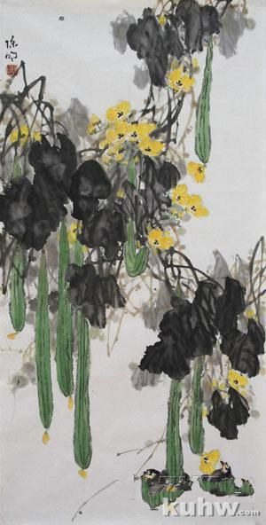 一幅作品中的丝瓜和花,要注意它们之间的色彩、形态上的变化关系,以求画面形式感的丰富。