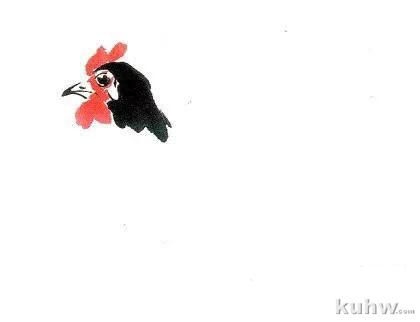 2.用大笔浓墨画头、嘴和眼,用曙红点鸡冠和肉垂。