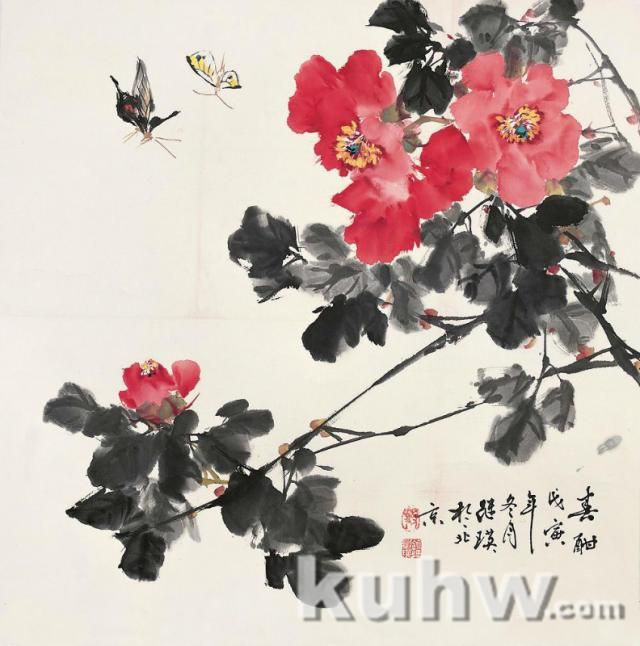 先画前翅三角形,接近背部笔要轻。再画后翅接前翅,圆中求方来找形,背看前翅压后翅,关系颠倒可不行。三笔点出头胸腹,可以断开求生动。触角两根不要粗,六足变化莫齐平。用笔过死成标本,有虚有实趣味生。