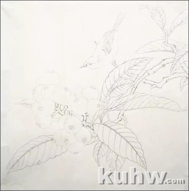 淡墨勾枇杷、反叶、鸟腹,中墨勾枝干、鸟背,重墨勾鸟嘴、正叶。线条不要太粗,最好用长锋笔来画。本幅作品用线较细。鸟的羽毛部分一般用虚线勾勒,飞羽、复羽部分可用实线。