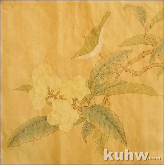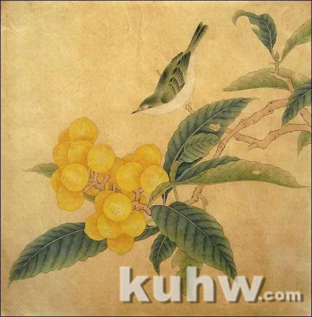 鸟背部以及反叶平涂淡草绿,正叶用淡花青统染两次。鸟下颌、胸腹部分平涂淡白色。枇杷平涂淡粉黄。枝干平涂淡赭石。