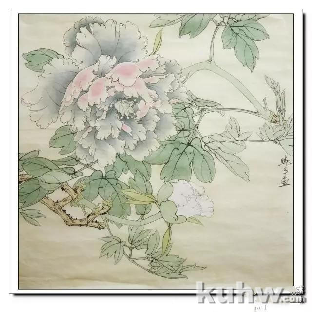 反叶:淡灰绿色(三绿+少许墨)平涂,草绿分染,墨绿色(草绿+少许墨)提染,随后用薄四绿整体罩染亮面,稍浓四绿勒主筋和辅脉。