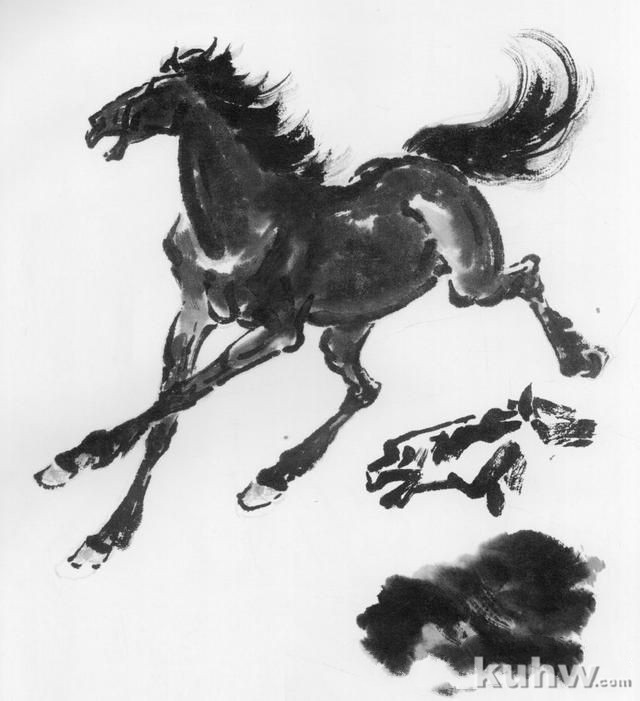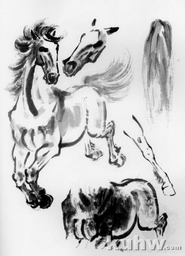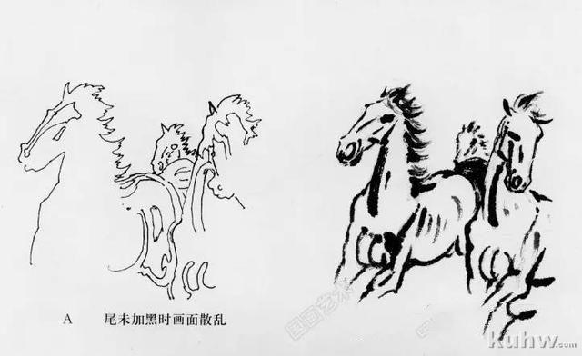 画黑马时要浓墨勾勒,行笔艰涩,一定要稳定行笔,效果才好。渲染:(1)墨色色阶不要过大反差;(2)笔触不要细碎。