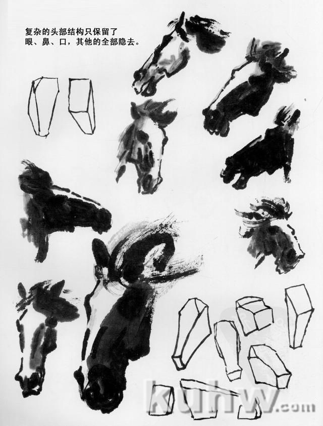 线以立其形质、墨以分其阴阳是悲鸿马中运用线的特点,其墨线已非传统意义上的墨线而是赋予了新思维、新技法、充满活力内容的线,在结构理论的指导下,勾勒出头部的几何结构然后用墨色加以渲染,形成鲜明的两个大面,更加概括、生动、传神。