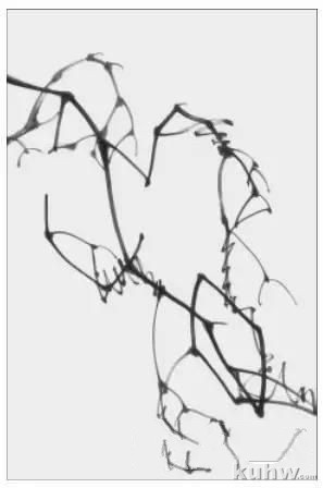 第一步:勾藤。斜倚式构图既可从画面左上方边角处出笔,也可以从画面的右上方边角处出笔,具体画法与要求是一样的,只是画面的尺幅不同而已。
