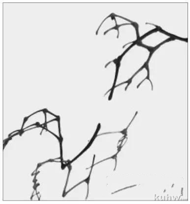 第一步:勾藤。这是斜倚式构图,即是从画面的左上方或右上方边角出笔勾藤,然后斜出向对面的下方边角处走笔分割,使画面上的主要景物或走向呈现出一种斜势,极富动感,但要防止完全对角平均分割的布局。