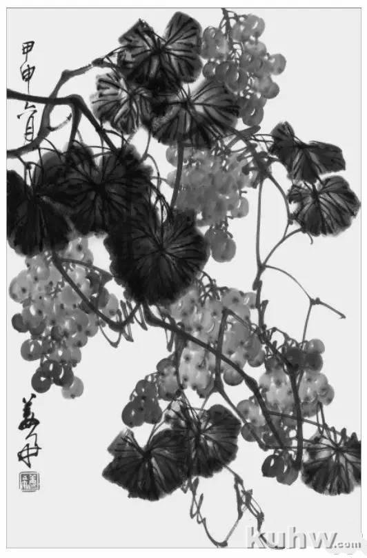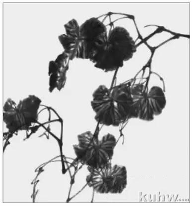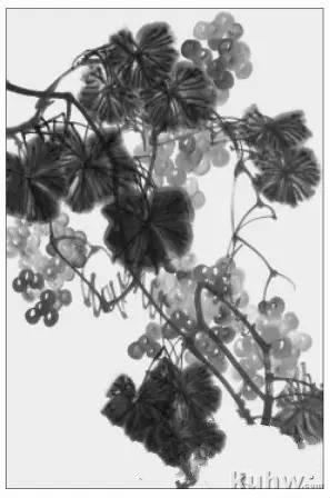 第二步: 叶。葡萄叶在写意的画法中,基本上都是纯以墨色的浓、淡、干、湿来完成的,如果叶子再用过多的色彩来画,则显得画面浮躁而近俗。但如果画幅较大,叶子较多,或为表现叶子的老嫩,或为表现某种特定效果时(如霞光、枯叶),也可以有墨色中调配一点曙红、朱 、藤黄或赭石等色,但不可过多。