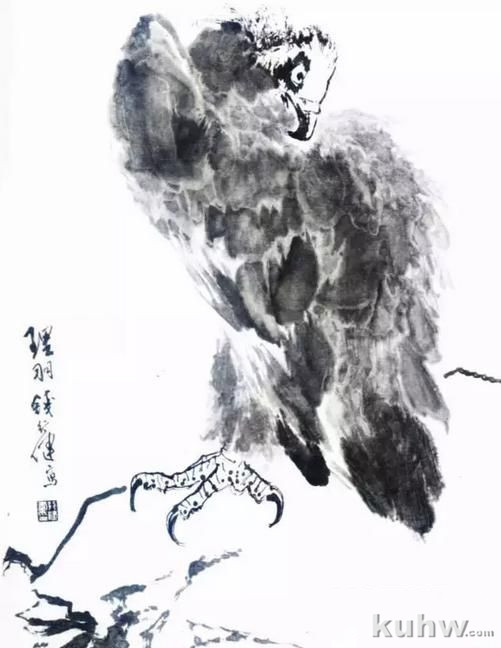用浓墨画好羽毛 ,等约六成干后,用大笔蘸清水用力再 在原墨痕上,使水将墨破开,产生自然韵致。使用此法注意掌握好干湿程度,不然,墨色臃肿,无生辣之感。↓↓↓