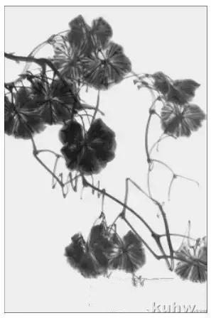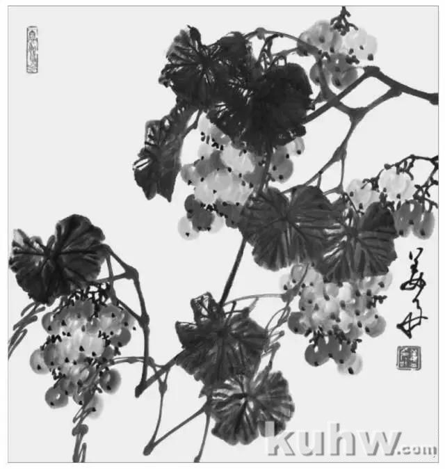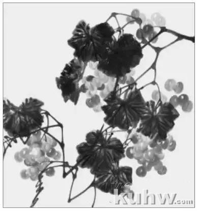 第二步: 叶。葡萄叶在写意的画法中,基本上都是纯以墨色的浓、淡、干、湿来完成的,如果叶子再用过多的色彩来画,则显得画面浮躁而近俗。但如果画幅较大,叶子较多,或为表现叶子的老嫩,或为表现某种特定效果时(如霞光、枯叶),也可以有墨色中调配一点曙红、朱 、藤黄或赭石等色,但不可过多。