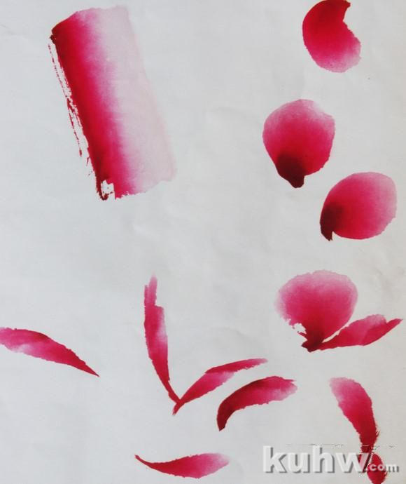 2、画牡丹的花色从红色起手,用白、曙红、胭脂三种颜料,首先用白色均匀地将笔调饱,水分不干也不湿,以稀糊状为宜,然后调曙红,要让笔上的颜色与白色有自然的过渡,然后开始练习用笔。用笔练习要有宽窄之分,要从上、下、左、右起笔,这样为以后的花瓣打下基础。