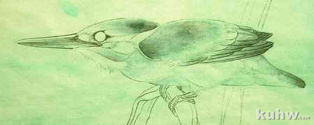 眼平涂朱�色。鸟背部罩染青蓝色(石青+酞青蓝),头部用青蓝色从后枕部位往头顶部位分染。中墨分染飞羽、复羽,留水线。胸、腹部平涂一层白色底色后用朱�在花青色继续分染。爪平涂淡朱�。下颌用淡朱�从根部往尖部分染。