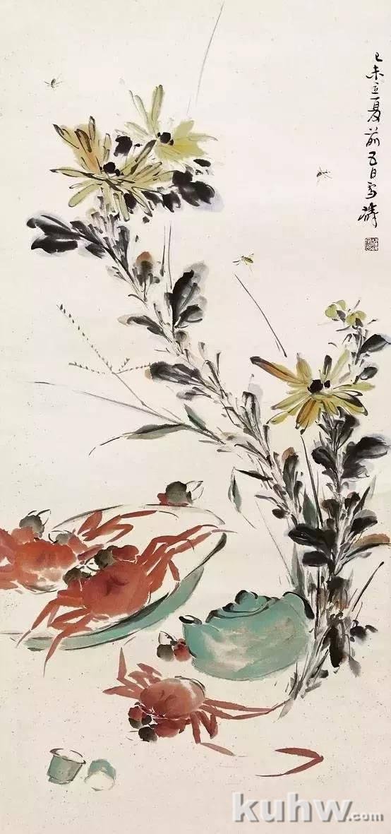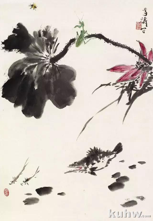 中国绘画注重线条,构图中以线型的安排为主,大致可有主、辅、破线三种类型。主线是确定型式的主导,辅线加强主线的气势,而破线一方面打破单调的布局,同时又以对比的方式再次突出主线。草虫虽小,在花鸟画中却并非是点缀,体态短小的一只蝉,有时可以视为一块必要的墨色;而生性敏捷的螳螂,在构图中往往是作为有折曲的线型来对待的,连那长长的触须,是低是扬,也要安排得当,细心的人仔细琢磨是不难领会的,至于疏密、聚散、动静、虚实等等,只起丰富主体的效果。金农的梅花有功力。但过于散漫一片,章法上是失败的。规律要注意总结,但不可为法使。只需刻意于画的中心,古人称之为气的结点,笔笔都要考虑这个中心,章法自然奇拔。